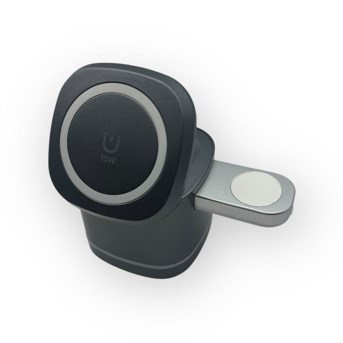 This 15W fast charger is a versatile and efficient solution for wirelessly charging your phone, watch, and Air-pods all at once. Its magnetic design ensures a secure connection and the fast charging speed saves you time. Keep all your devices powered up with this 3 in 1 charger.