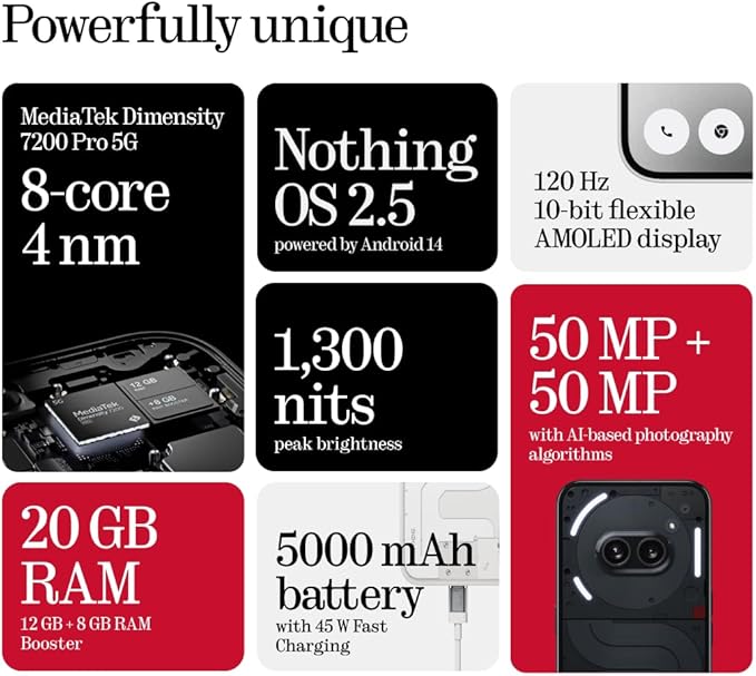 - 【5000mAH Fast Charging Battery】Nothing phone (2a) keeps going for 2 days straight* with our biggest battery to date.Our most advanced battery with improved longevity by over 25%.45W Fast Charge A day's power in just 20 mins,with 36% faster charging speeds.