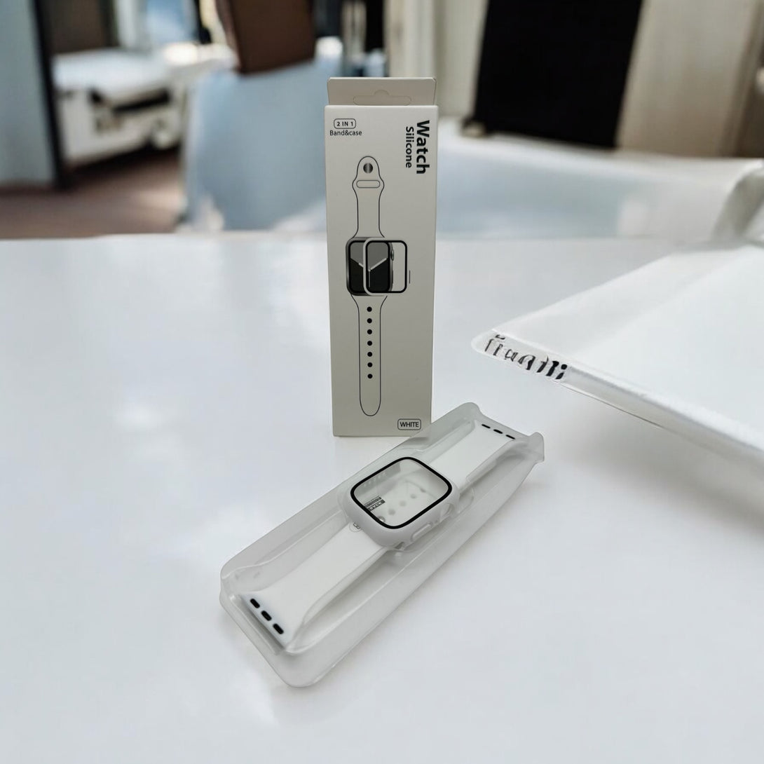 "Upgrade your style with our Watch Silicon 2 IN 1 Band&Case, designed exclusively for Apple Watch (44m/white). Made with premium silicone material, this band&case combo offers both protection and comfort. Elevate your look and stand out from the crowd with our luxurious and sophisticated design."